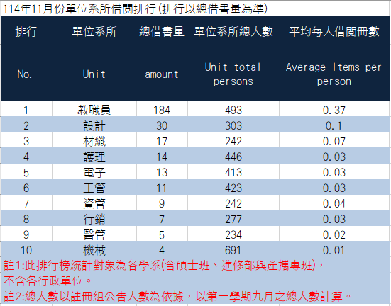 114年 11月 系所借閱排行榜